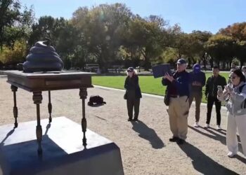 Una figura en bronce de un excremento sobre un escritorio fue puesta este jueves cerca del Capitolio de Estados Unidos...