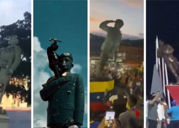 Al menos cuatro estatuas del fallecido mandatario de Venezuela Hugo Chávez fueron derribadas este lunes por manifestantes durante las protestas...