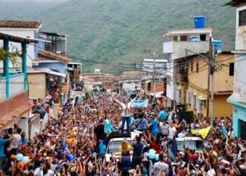 Cientos de personas recibiern este jueves a la líder opositora María Corina Machado en la localidad de Pampanito, durante su...