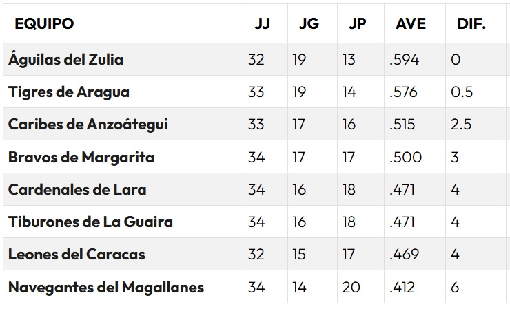 Detrás aparece Tigres de Aragua con 19-14 (.576), apenas medio juego por debajo, mientras que Caribes de Anzoátegui ocupa el tercer lugar con récord de 17-16 (.515), a 2.5 juegos del líder.