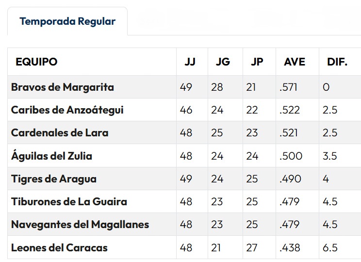 La tabla de la Temporada Regular muestra a los Bravos de Margarita como líderes del campeonato, con 49 juegos disputados, 28 victorias y 21 derrotas, para un promedio de .571, manteniéndose en la cima sin diferencia respecto al primer lugar.