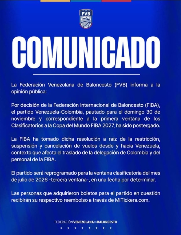 La Federación Internacional de Baloncesto (FIBA) decidió postergar el partido de clasificación para el Mundial 2027 entre La Vinotinto de las Alturas y Colombia, que estaba previsto para este domingo 30 de noviembre.