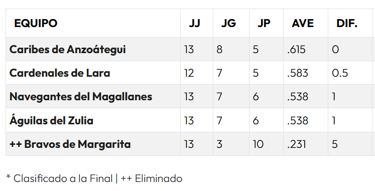 Sin embargo, la situación es crítica para Bravos de Margarita, equipo que ya figura como eliminado según la nomenclatura del cuadro. Con apenas 3 victorias frente a 10 derrotas en 13 compromisos, poseen el promedio más bajo de la liga (.231) y se encuentran a una distancia de 5 juegos del primer puesto.