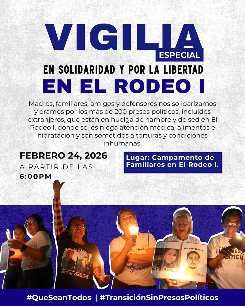 El Comité por la Libertad de los Presos Políticos (Clippve) convocó a una vigilia en las inmediaciones de la cárcel de El Rodeo I en solidaridad con los más de 200 presos políticos que permanecen en huelga de hambre y sed, incluidos extranjeros.