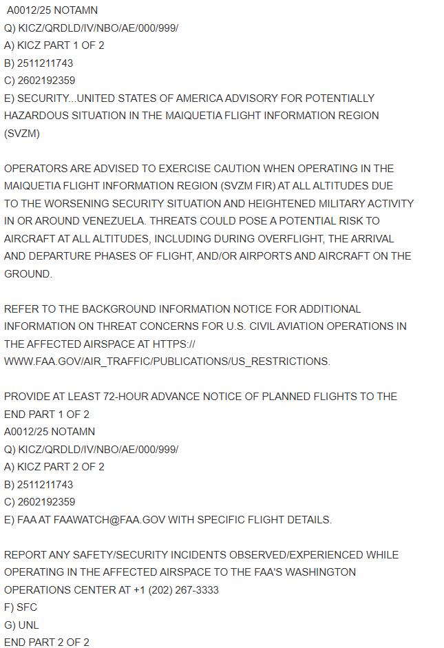 La advertencia, publicada como NOTAM A0012/25, se refiere específicamente a la Región de Información de Vuelo Maiquetía (SVZM), que abarca gran parte del espacio aéreo venezolano. La FAA recomienda a los operadores ejercer extrema precaución al sobrevolar esta zona, incluyendo durante despegues, aterrizajes y operaciones en tierra.