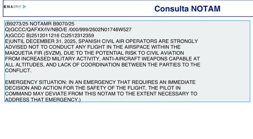 La medida estará vigente hasta el 31 de diciembre de 2025, debido al riesgo potencial para la aviación civil derivado del aumento de actividad militar, presencia de armamento antiaéreo en todos los niveles de altitud y falta de coordinación entre las partes en conflicto, según el NOTAM B9273/25 publicado por la Empresa Nacional de Navegación Aérea (ENAIRE).