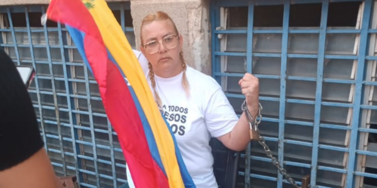 En un acto de desesperación y protesta pacífica, Evelis Cano, madre del preso político Jack Tantak Cano, se encadenó este lunes frente a la sede de Zona 7 de la Policía Nacional Bolivariana (PNB) para exigir la liberación inmediata de su hijo y de todas las personas detenidas por motivos políticos.