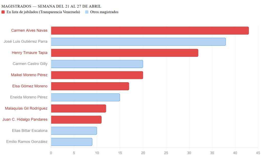 El volumen de fallos —con un pico de 168 sentencias en un solo día, el 24 de abril— llama la atención por su concentración temporal y porque varios de los magistrados más «productivos» en esta semana figuran entre los que serían jubilados según información extraoficial recogida por la organización no gubernamental Transparencia Venezuela.