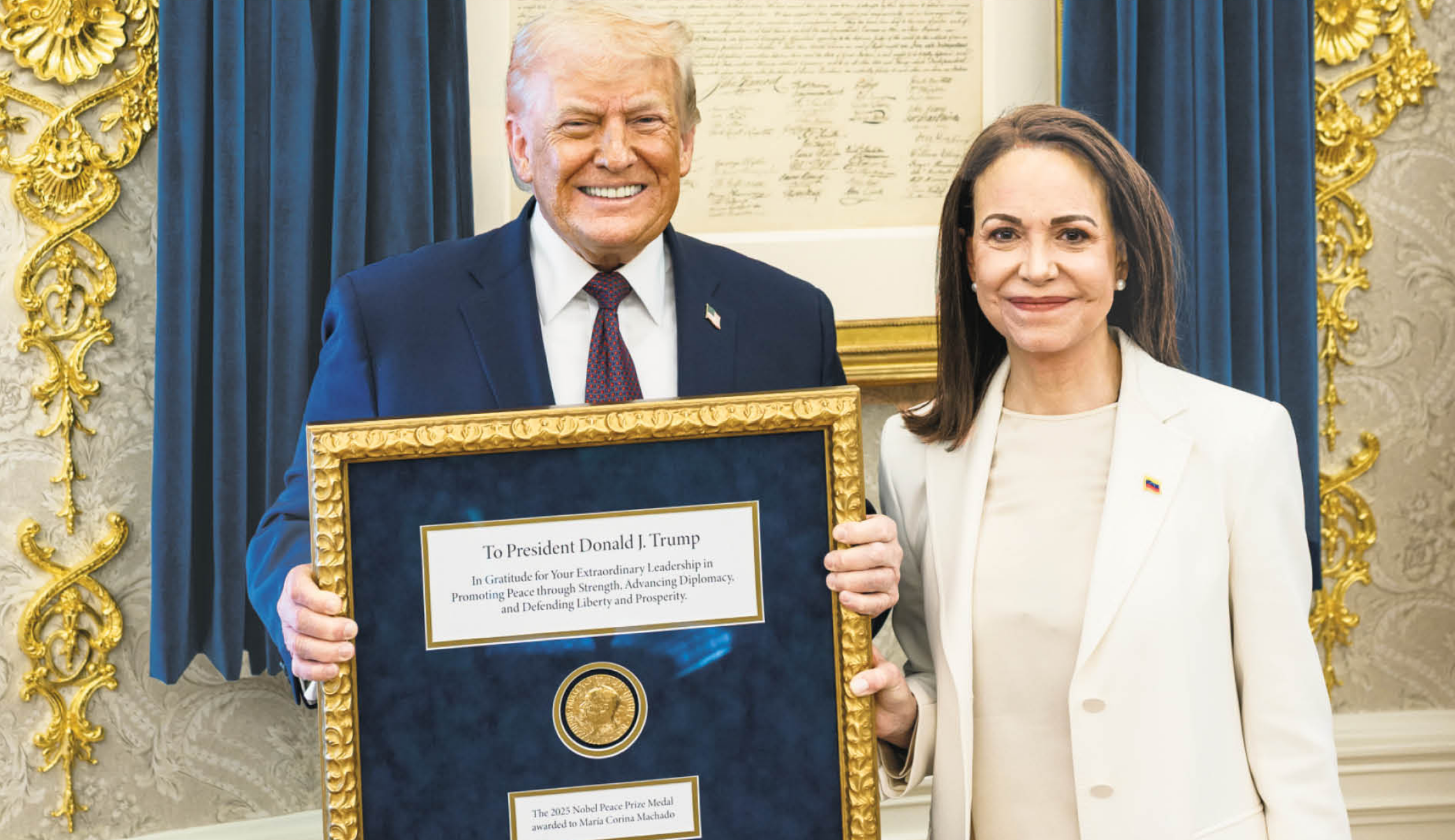 María Corina afirmó que su gesto hacia Trump buscó evocar ese mismo espíritu histórico: “Doscientos años después, la gente de Bolívar le está devolviendo al líder de Washington una medalla —en este caso, la del Premio Nobel de la Paz— como reconocimiento a su compromiso especial con nuestra libertad”, expresó.