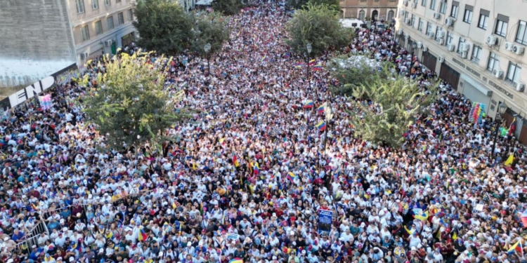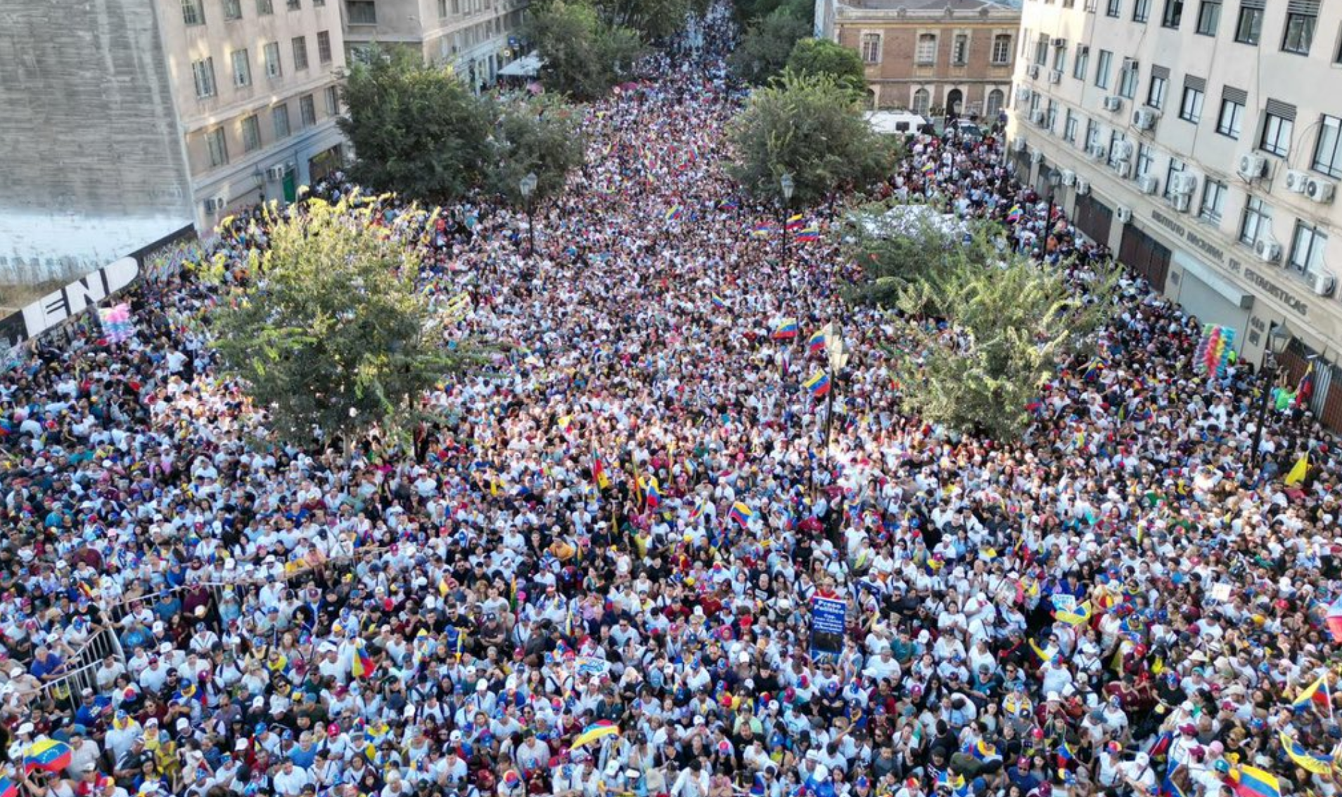 Miles de venezolanos se concentraron este jueves en el centro de Santiago en una demostración convocada por la líder venezolana, María Corina Machado, la mayor manifestación pública desde que salió de Venezuela en diciembre pasado.
