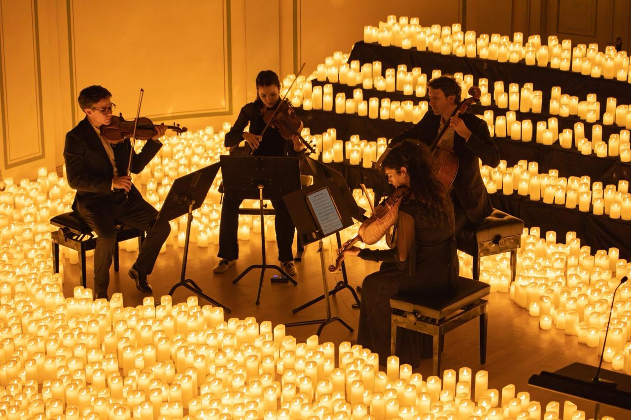 Cientos de velas iluminaron el recinto mientras el Parallel Quartet, integrado por Alfredo Ancillo (violín), Laura Hidalgo (violín), Fátima Poblete (viola) y Stamen Nikolov (cello), interpretaba un repertorio que combinó clásicos universales con piezas profundamente ligadas a la identidad venezolana.