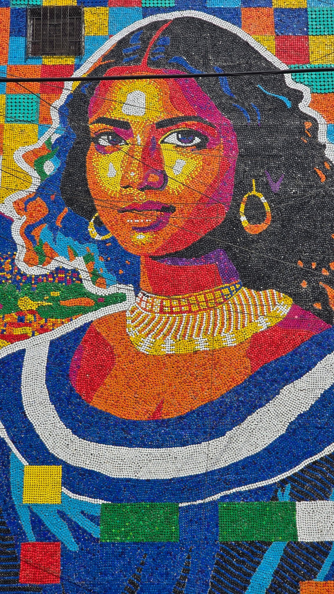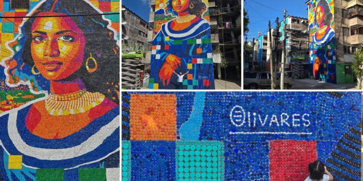 Inspirado en ‘La Gioconda’, una de los obras más famosas del mundo del italiano Leonardo da Vinci, el artista venezolano Oscar Olivares elaboró un mural con más de 100.000 tapas plásticas de colores recicladas en una zona populosa de El Salvador como un homenaje a la mujer salvadoreña y latinoamericana.