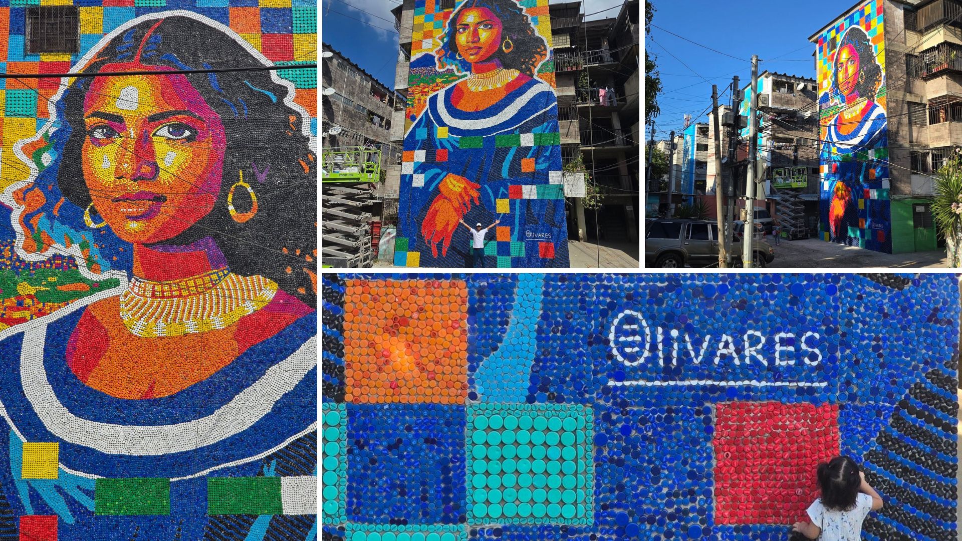 La obra de 13 metros de altura y siete metros de ancho representa «el mural más alto que hemos hecho, por lo tanto es el mural de tapas más alto del mundo», dijo en una conversación con EFE el joven artista caraqueño.