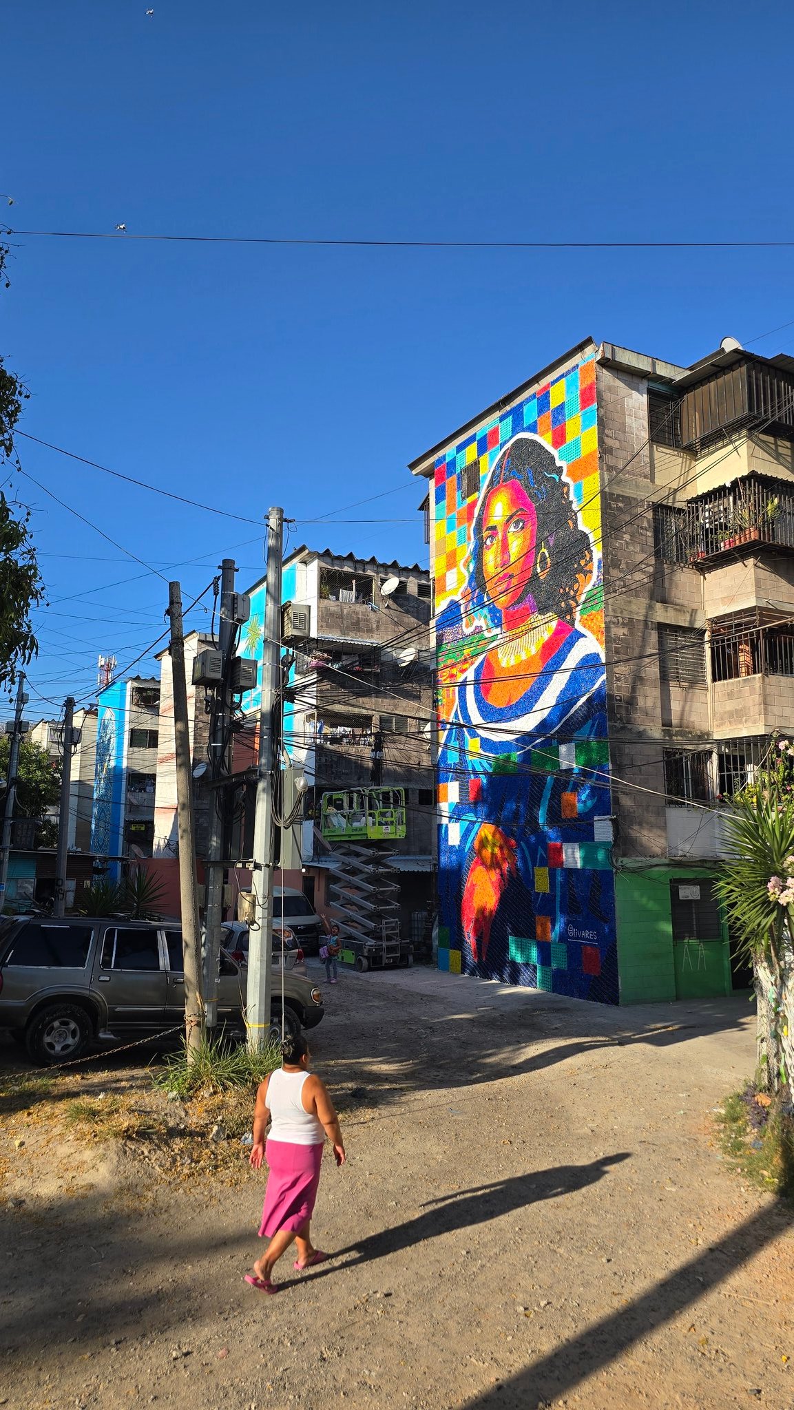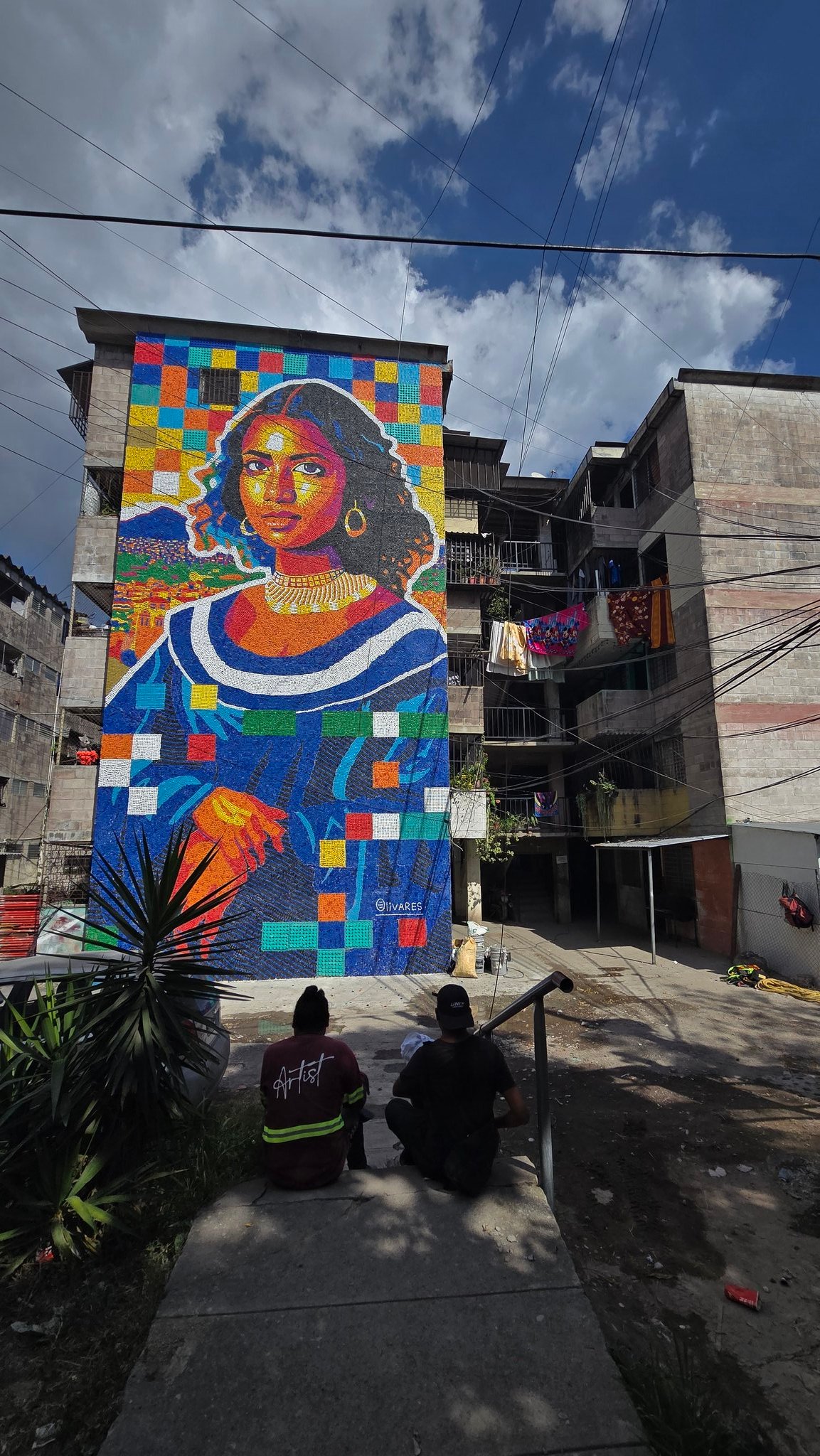 Al artista venezolano lo contactó hace un año la organización italiana Custom Made Stories Foundation, que desde 2023 realiza un proyecto de murales en los edificios multifamiliares de la Colonia Zacamil y cuya meta es intervenir 50 edificios hasta 2029. Olivares ya es parte de esta meta.