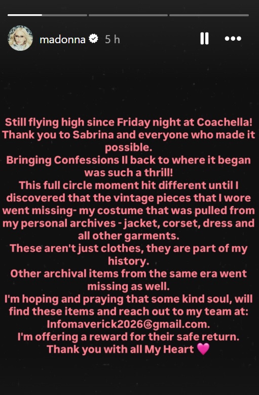` Madonna ofrece recompensa para recuperar el atuendo perdido que usó en Coachella - Monitoreamos
