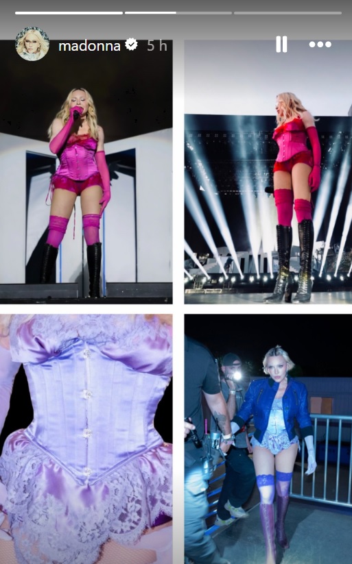 En el escenario, comentó que tanto el corsé como las botas y la chaqueta eran prendas que había recuperado de su vestuario de 2006.