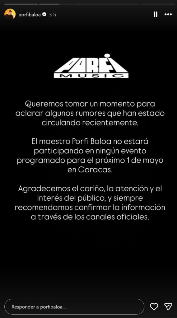 «El maestro Porfi Baloa no estará participando en ningún evento programado para el próximo 1 de mayo en Caracas. Agradecemos el cariño, la atención y el interés del público, y siempre recomendamos confirmar la información a través de los canales oficiales», señaló el comunicado publicado en las redes sociales del artista.