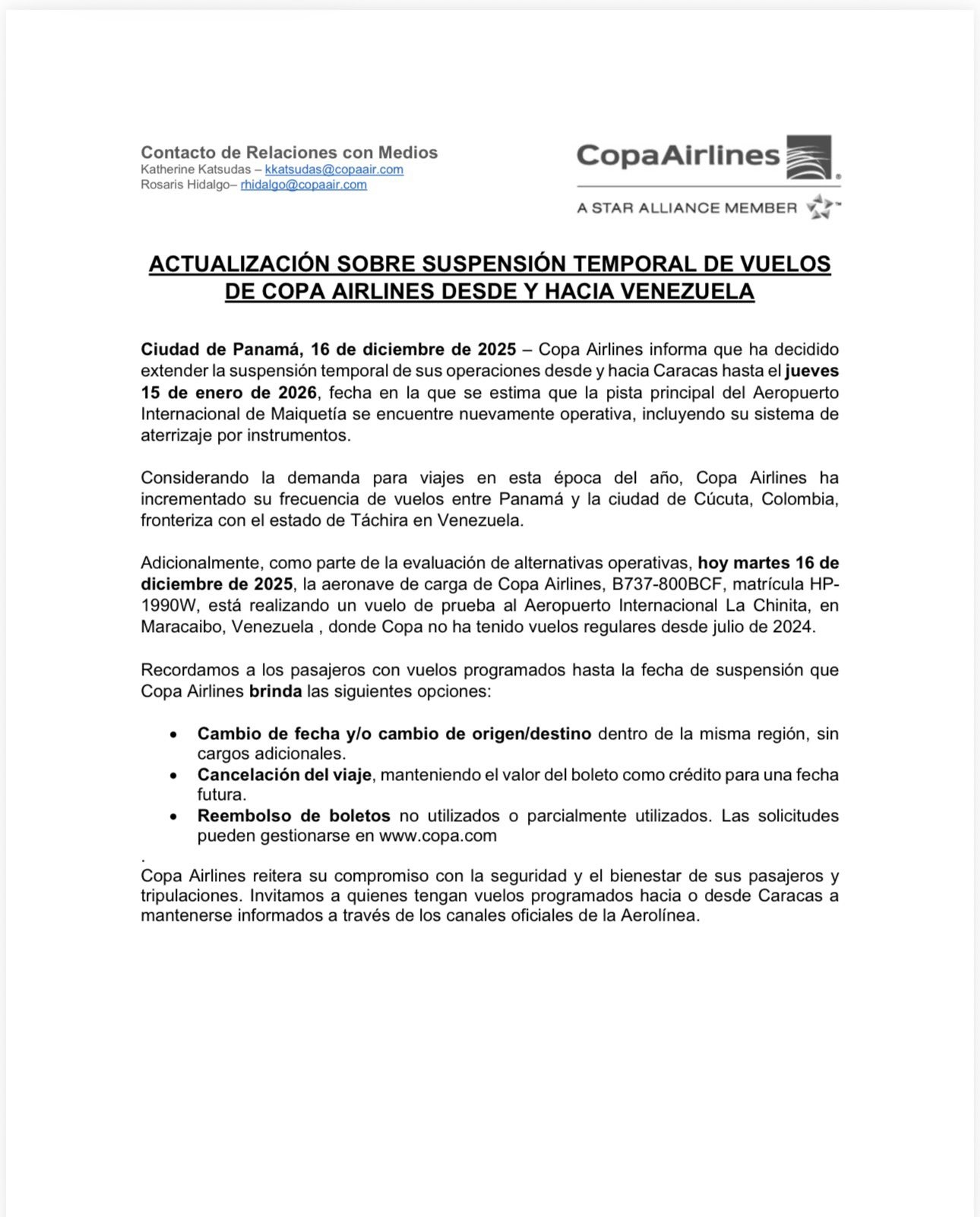 «Copa Airlines informa que ha decidido extender la suspensión temporal de sus operaciones desde y hacia Caracas hasta el jueves 15 de enero de 2026, fecha en la que se estima que la pista principal del Aeropuerto Internacional de Maiquetía se encuentre nuevamente operativa, incluyendo su sistema de aterrizaje por instrumentos», indicó este martes un comunicado de la empresa.