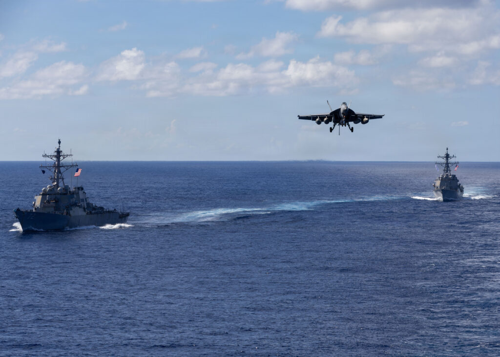 The Arleigh Burke-class guided-missile destroyers USS Mahan (DDG 72), left, and USS Bainbridge (DDG 96) sail in formation as an F/A-18 Super Hornet, assigned to Carrier Air Wing Eight embarked aboard USS Gerald R. Ford (CVN 78), descends on final approach to land on the aircraft carrier, Nov. 13, 2025. U.S. military forces, like the Gerald R. Ford Carrier Strike Group, are deployed in support of the U.S. Southern Command mission, Department of War-directed operations, and the President’s priorities to disrupt illicit drug trafficking and protect the homeland.