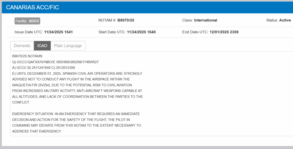 El Gobierno español, a través de su autoridad aeronáutica, emitió una alerta internacional (NOTAM B9070/25) en la que recomienda encarecidamente a todos los operadores aéreos españoles no volar en el espacio aéreo venezolano, específicamente en la Región de Información de Vuelo de Maiquetía (FIR SVZM), debido a un riesgo potencial para la aviación civil.