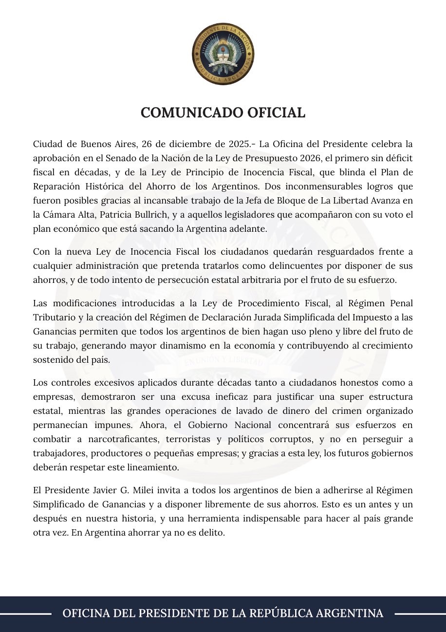 En un comunicado difundido este sábado, la Presidencia argentina resaltó que la nueva ley permite «que todos los argentinos de bien hagan uso pleno y libre del fruto de su trabajo, generando mayor dinamismo en la economía y contribuyendo al crecimiento sostenido del país».