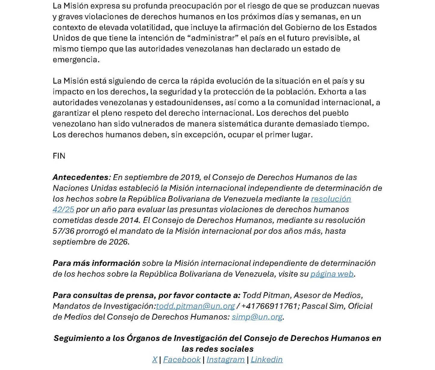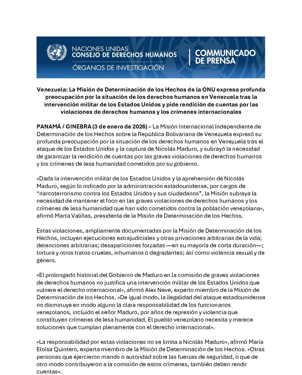 Este sábado 3 de enero, la Misión de Determinación de los Hechos sobre Venezuela expresó su profunda preocupación tras los ataques a varios objetivos y la captura de Nicolás Maduro en Venezuela por el gobierno de Estados Unidos.