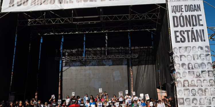 «A 50 años del golpe genocida, ¡qué digan dónde están!», se lee sobre el escenario la consigna principal de este aniversario, en referencia a los miles de desaparecidos que provocó el Gobierno militar que controló el país desde marzo de 1976 a través de un sistema represivo organizado.
