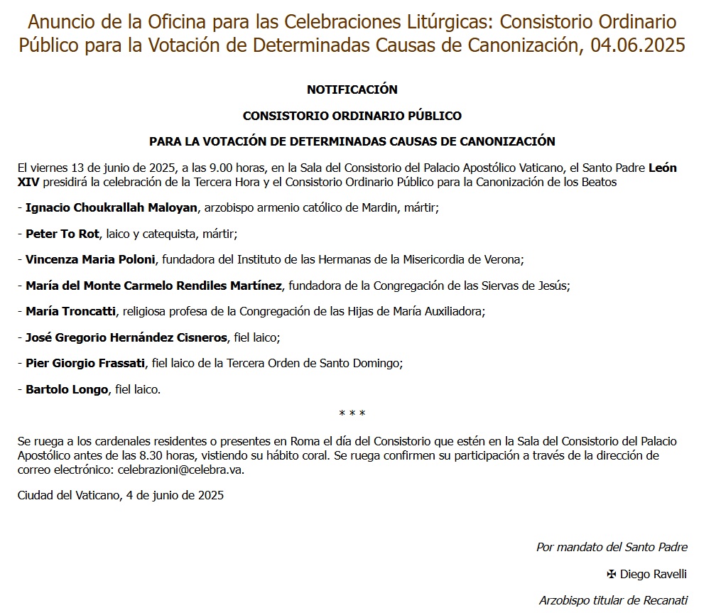 «El viernes 13 de junio de 2025, a las 9.00 horas, en la Sala del Consistorio del Palacio Apostólico Vaticano, el Santo Padre León XIV presidirá la celebración de la Tercera Hora y el Consistorio Ordinario Público para la Canonización de los Beatos», señala el anuncio realizado por el Vaticano en su página web.