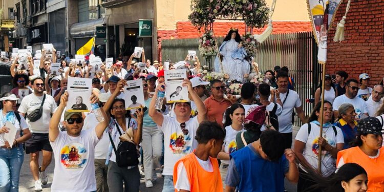 Durante la caminata, los asistentes levantaron cientos de carteles con fotografías de las personas que están detenidas arbitrariamente por el régimen chavista, convirtiendo la procesión en un acto de fe y denuncia.