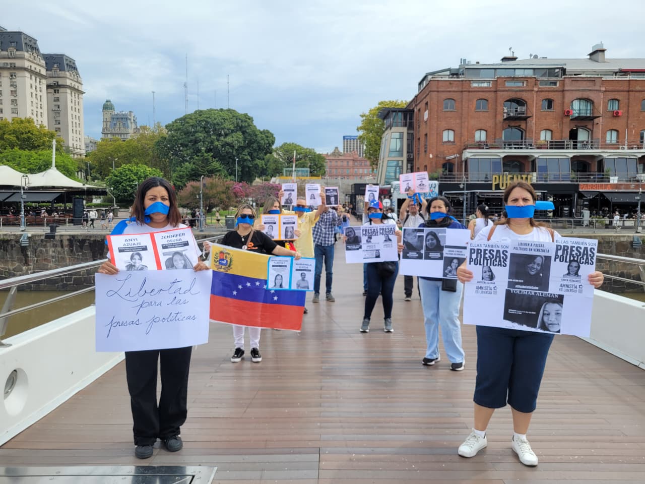 Activistas venezolanos en Argentina se concentraron este sábado en el Puente de la Mujer, en Puerto Madero, para exigir la libertad de todos los presos políticos en Venezuela.