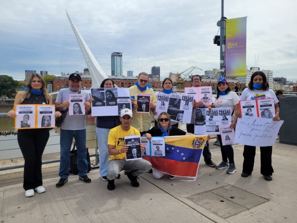 “Nos encontramos acá desde el Puente de la Mujer en conmemoración y por la lucha de todas esas mujeres presas venezolanas, pero también es importante mencionar a un preso político argentino como lo es Germán Giuliani. Le pedimos al régimen de Delcy Rodríguez por la libertad de cada uno de los venezolanos y extranjeros que hoy se encuentran detenidos”, afirmó.