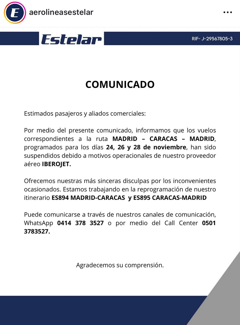 ` Aerolínea Estelar suspende vuelos desde Venezuela a España hasta el 28 de noviembre - Monitoreamos