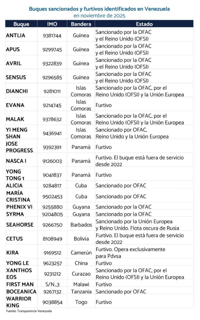 Un nuevo informe de Transparencia Venezuela, en el exilio, reveló que cuatro de cada diez tanqueros que operaron cerca de las costas venezolanas en noviembre fueron irregulares, al pertenecer a flotas sancionadas, furtivas o “oscuras”.