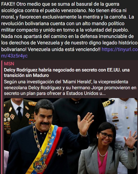 «FAKE!! (falso). Otro medio que se suma al basural de la guerra sicológica contra el pueblo venezolano. No tienen ética ni moral, y favorecen exclusivamente la mentira y la carroña», expresó la vicepresidenta en su canal de Telegram.