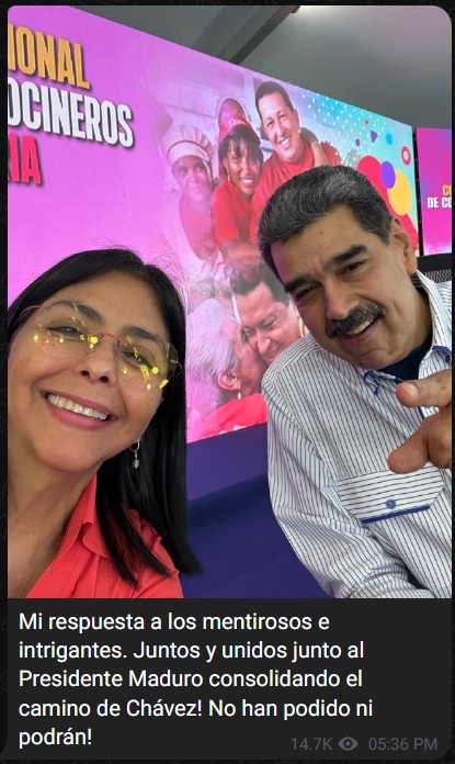En otro mensaje, Rodríguez publicó una selfi en la que sonríe al lado del mandatario, y escribió: «Mi respuesta a los mentirosos e intrigantes. Juntos y unidos junto al presidente Maduro consolidando el camino de (Hugo) Chávez. No han podido ni podrán».
