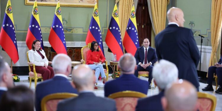 La encargada del régimen chavista, Delcy Rodríguez, participó este martes en un acto en el que se realizó la firma de nuevos acuerdos entre Petróleos de Venezuela (Pdvsa), el Ministerio de Hidrocarburos, y la Corporación Nacional de Hidrocarburos de Italia (ENI).