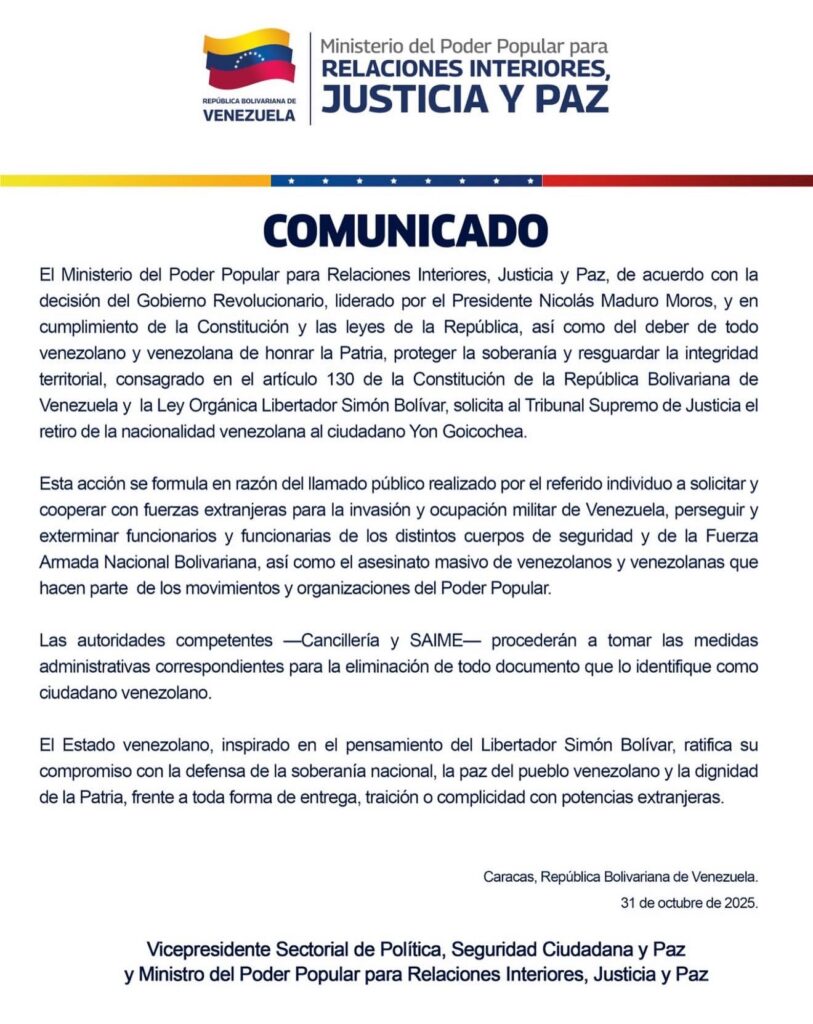El comunicado oficial del Ministerio del Poder Popular para Relaciones Interiores, Justicia y Paz, fechado el 31 de julio de 2025, señala que el Estado venezolano no permitirá injerencias externas en sus asuntos internos y que se tomarán medidas legales y diplomáticas para proteger los intereses nacionales.