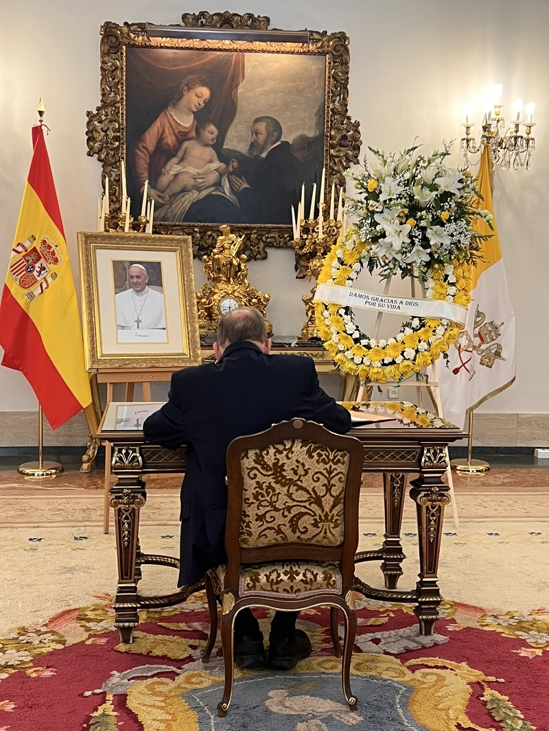 El presidente electo de Venezuela, Edmundo González Urrutia, firmó este jueves en Madrid el libro de condolencias por el fallecimiento del papa Francisco, cuyo funeral y sepultura se llevará a cabo este sábado 26 de abril.