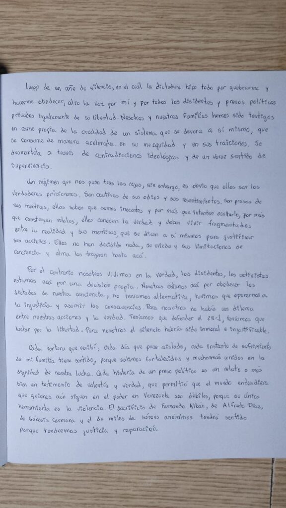 Luego de un año de silencio, en el cual la dictadura hizo todo por quebrarme y hacerme obedecer, alzo la voz por mí y por todos los disidentes y presos políticos privados injustamente de su libertad. Nosotras y nuestras familias hemos sido testigos en carne propia de la crueldad de un sistema que se devora a sí mismo, que se censura de manera acelerada. En su nequidad y en sus traiciones, se desmonta a través de contradicciones ideológicas y de un voraz sentido de supervivencia.