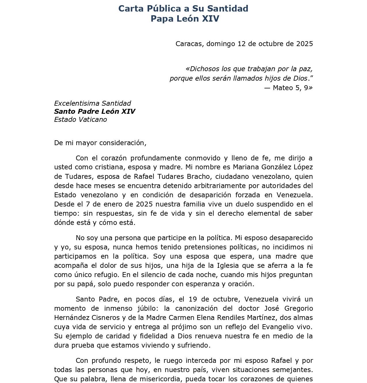 Mariana González de Tudares, esposa de Rafael Tudares Bracho, envió este domingo una carta al papa León XIV al cumplir 278 días en desaparición forzada.