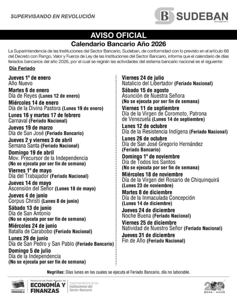 La Superintendencia de las Instituciones del Sector Bancario de Venezuela (Sudeban) publicó en sus redes sociales el calendario de los días feriados bancarios para el año 2026.