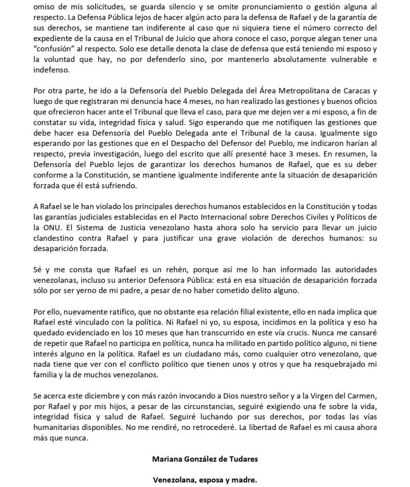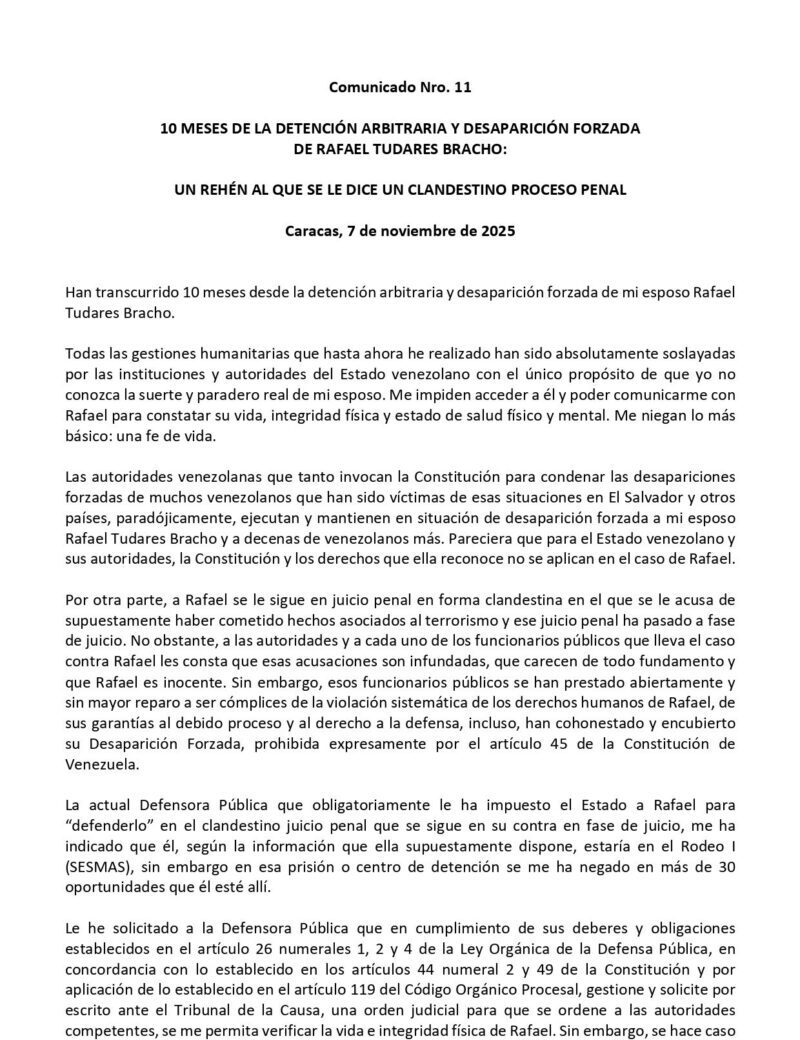 «10 meses desde el día que funcionarios del Estado se llevaron a mi esposo Rafael Tudares Bracho. 10 meses de la detención arbitraria y desaparición forzada en la que se mantiene a Rafael. 10 meses pidiendo una fe de vida sin que las autoridades den respuesta», escribió la hija del presidente electo Edmundo González Urrutia en su cuenta oficial en la red social X.