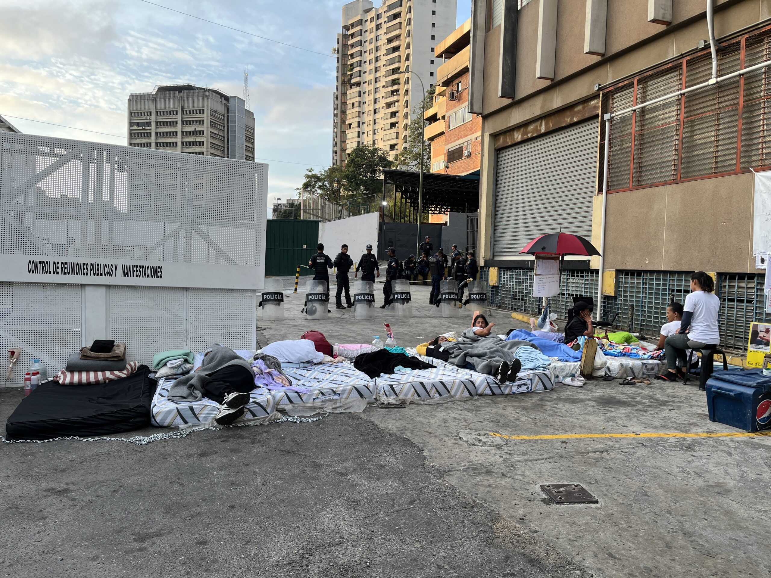 La organización no gubernamental compartió en la red social X imágenes que muestran a los familiares sobre colchonetas alineadas, cerca de quienes había más de una decena de policías y escudos antimotines.