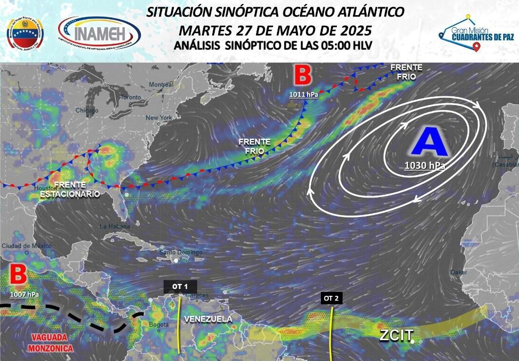 El Instituto Nacional de Meteorología e Hidrología (Inameh) confirmó que para este martes 27 de mayo la onda tropical Nro. 1 se desplaza por el centro occidente de Venezuela.