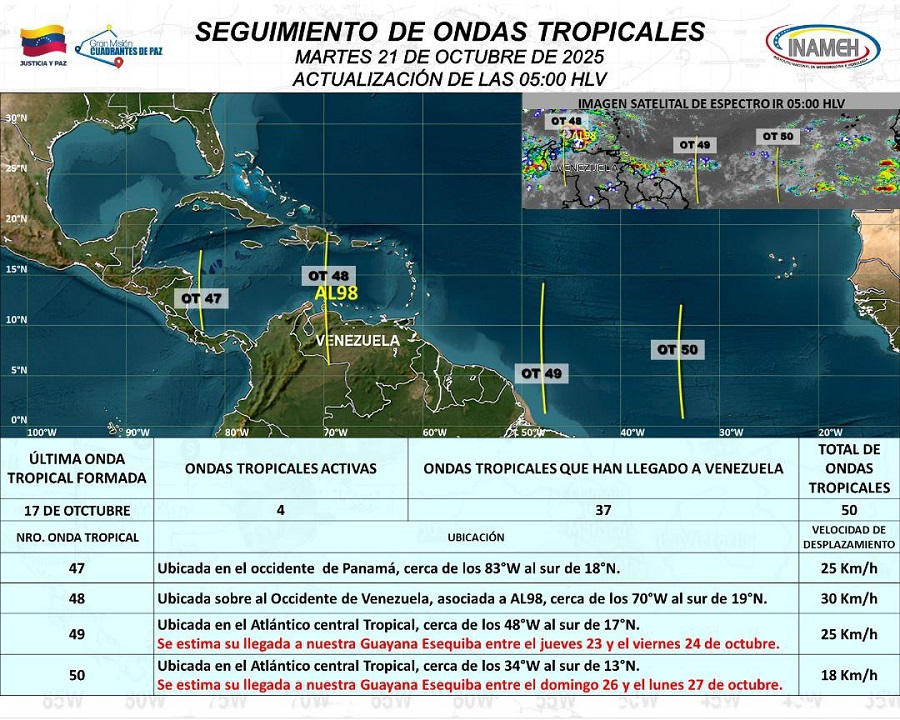 El Instituto Nacional de Meteorología e Hidrología (Inameh) prevé para este martes 21 de octubre nubosidad y luvias de intensidad variable en varias gran parte del país ante el paso de la onda tropical Nro. 48 por el territorio nacional.