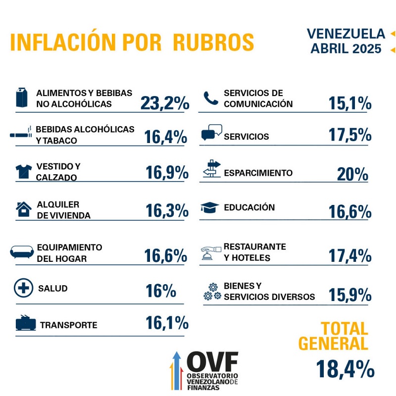 El reciente informe emitido por el Observatorio Venezolano de Finanzas (OVFF) reveló que la inflación en Venezuela para el mes de abril de 2025 se ubicó en 18,4% mensual, 172% interanual y 63,1% acumulada.