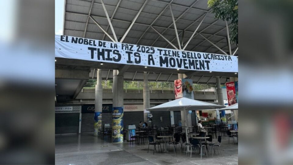 Portada » La pancarta en la UCAB: «El Nobel de la Paz 2025 tiene sello ucabista. This is a movement»