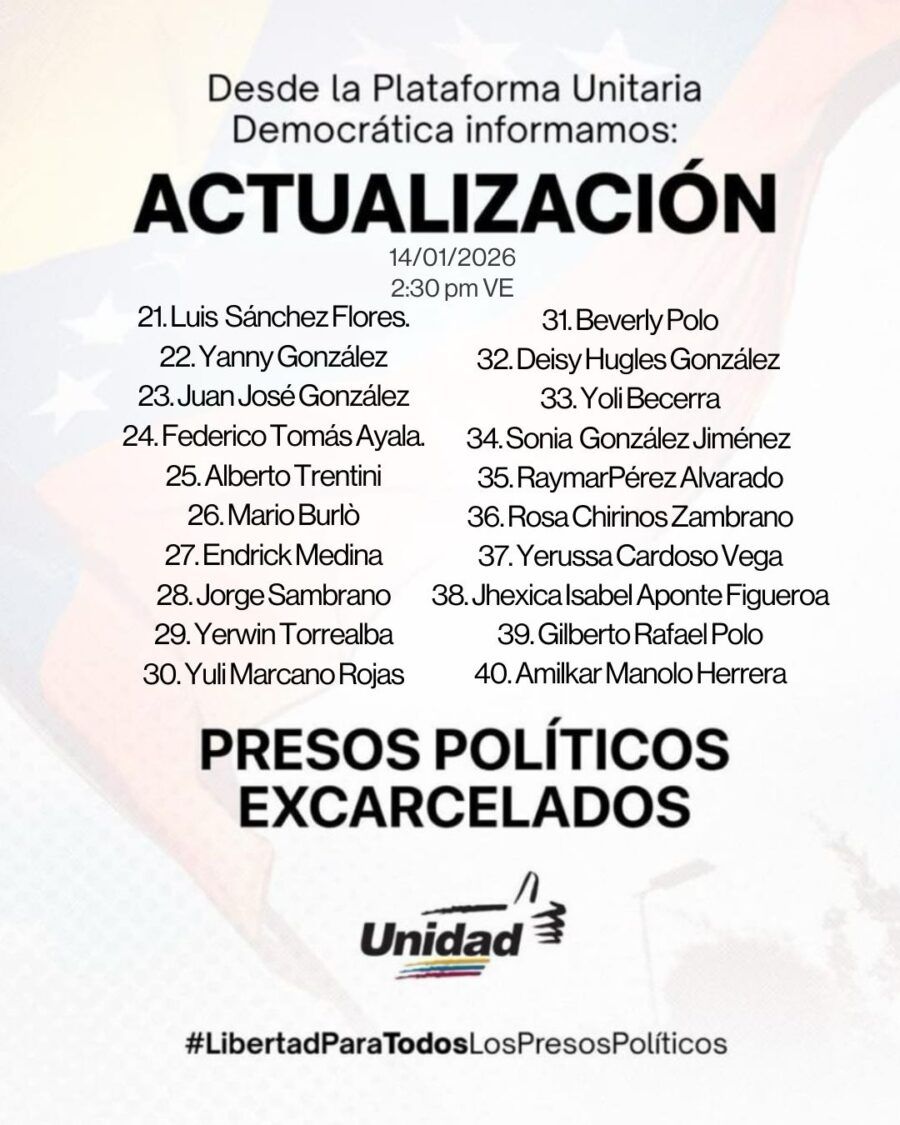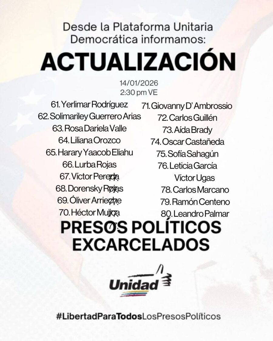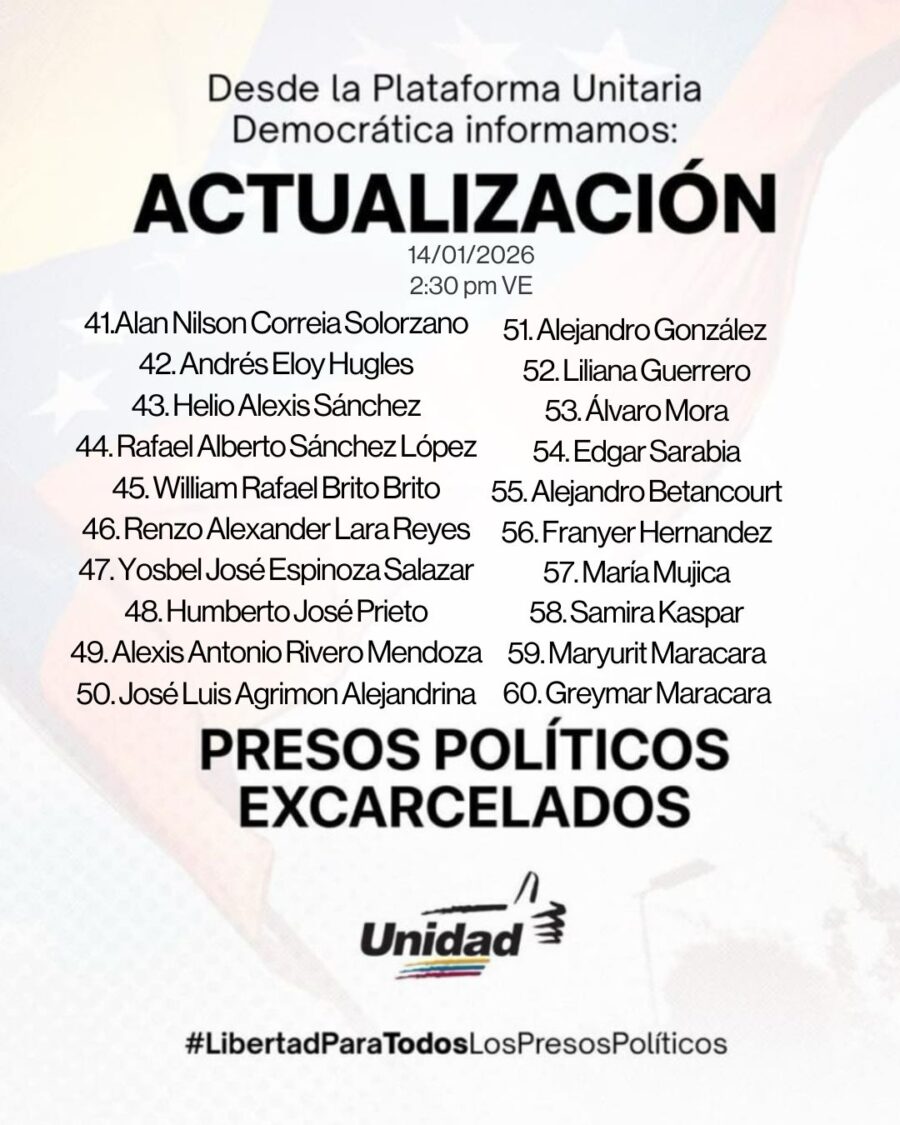 La Plataforma Unitaria Democrática publicó este miércoles 14 de enero una lista actualizada y confirmada de presos políticos excarcelados, que ascienden a 100, una cifra muy distinta a los 400 afirmados por el presidente de la Asamblea Nacional chavista, Jorge Rodríguez.