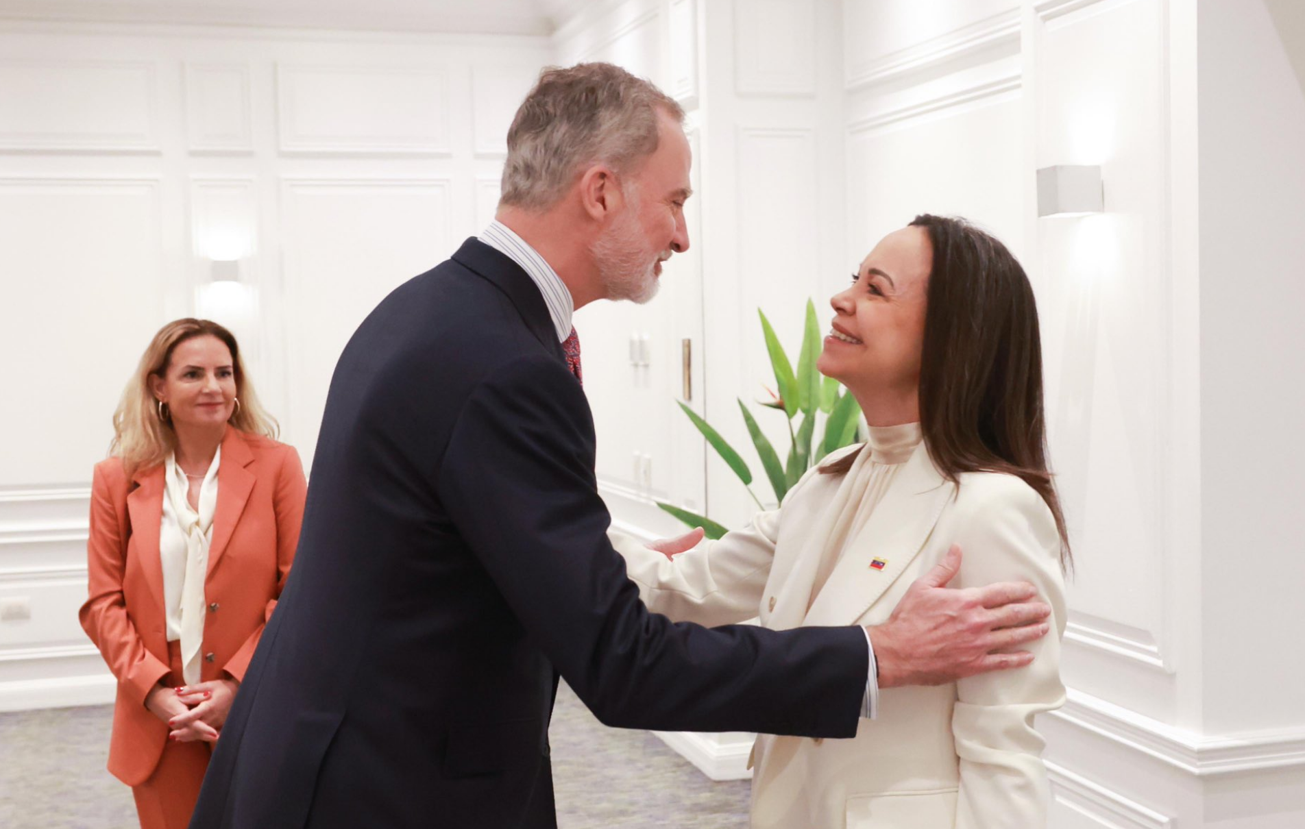 La líder venezolana María Corina Machado sostuvo este miércoles un encuentro con el Rey Felipe VI de España, en el marco de las actividades oficiales por la toma de posesión del presidente chileno José Antonio Kast.