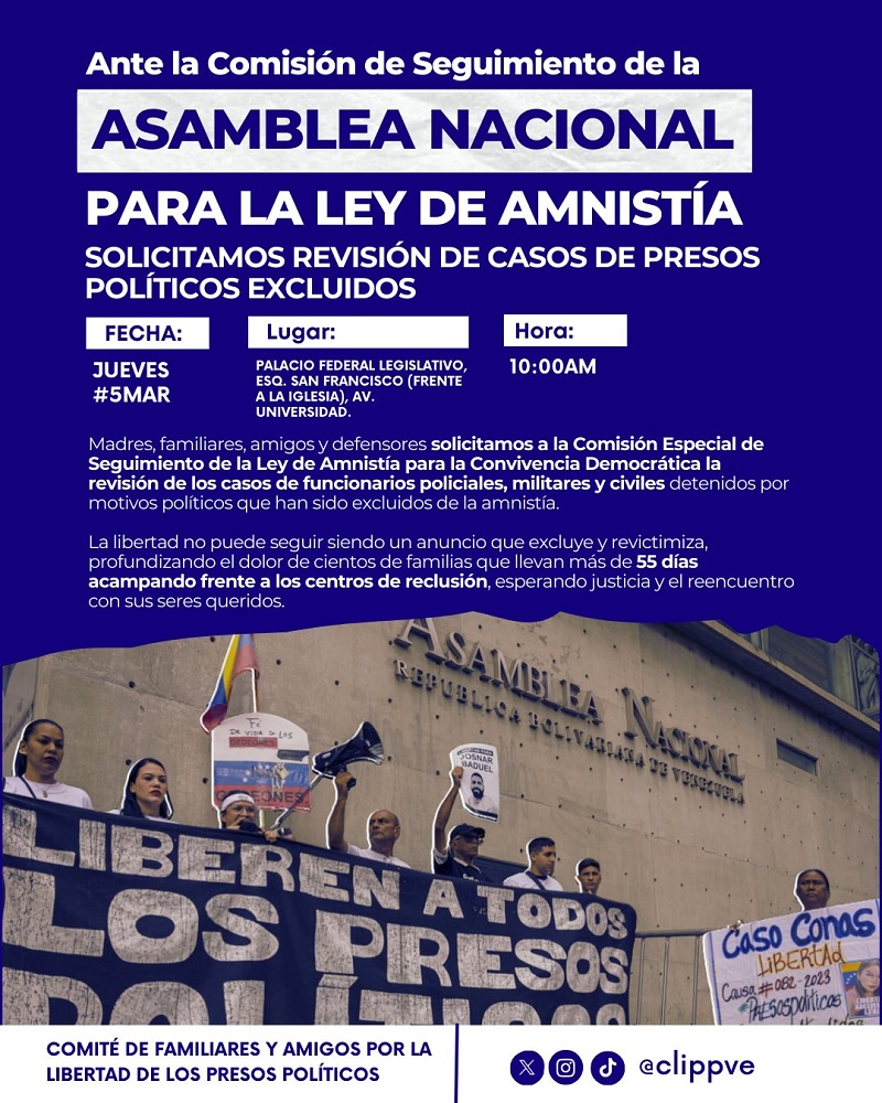La ONG Comité por la Libertad de los Presos Políticos (Clippve) convocó a una jornada pacífica ante la Asamblea Nacional chavista para este jueves 5 de marzo, con el objetivo de solicita, la revisión de casos que han sido excluidos de la Ley de Amnistía para la Convivencia Democrática, aprobada en el mes de febrero.